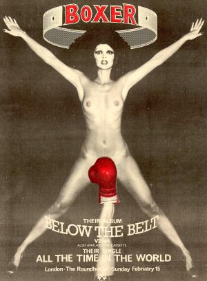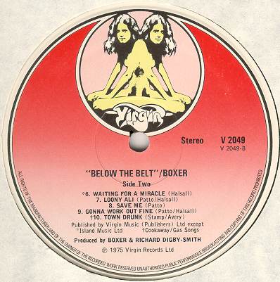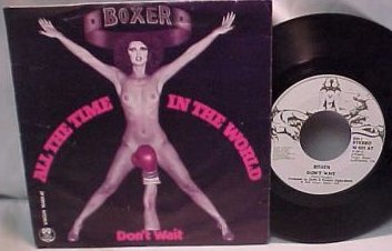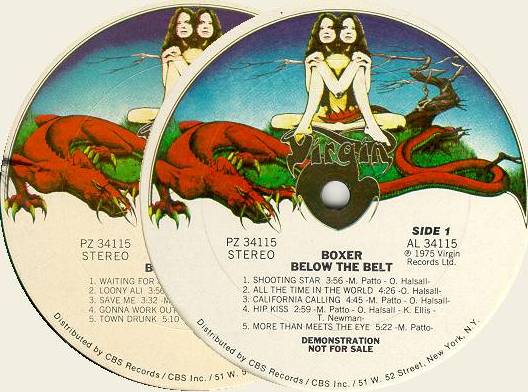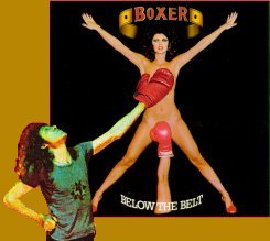 "Below The Belt" established that Boxer would be a straight-ahead rock band. Ollie and Mike were writing together again, but the new music did not hark back to the days of Patto (you may notice that "Shooting Star" has a chord progression that was also used in "Time To Die" on Patto's first album, though). According to the host for the BBC session the band did prior to the album's release, it was originally going to be titled "Round 1" or "Round One". Their first album was produced and engineered by Richard Digby-Smith, an engineer for Patto's "Hold Your Fire" and "Roll 'Em Smoke 'Em..." albums. Overall, the production gives the band a good, full sound, but as with many bands, it's been said that the album failed to capture their impressive live sound. All of the band's members were great players, but showcasing of their soloing capabilities was kept to a minimum, which shows that Mike and Ollie were more focused on the songwriting than the extended guitar/keyboard solos that were typical of the early to mid-seventies. In fact, the "All The Time In The World" single does not feature any soloing at all. For the guitar fans, there is still plenty of great guitar from Ollie. The slide work in "California Calling", the tasteful solo in "More Than Meets The Eye", the volume/echo bits in "Gonna Work Out Fine", and Ollie singing along with his guitar on "Save Me" are a few of the moments that come to mind The album contains some great tunes. "California Calling", "More Than Meets The Eye", "Waiting For A Miracle", and "Save Me" are my personal favorites. "Waiting For A Miracle" is a great remake of Ollie's tune from the Tempest "Living In Fear" album (1974). "Town Drunk" is a slow, bluesy tune that features a great vocal from Mike -- it was written by Terry Stamp and Jim Avery for Terry's "Fatsticks" album (1975), on which both Ollie and Tony Newman played.. Unfortunately, the album cover received more attention than the music. It featured a model named Stephanie Mariann. The first pressings of the album had a full-frontal nude photo on the back cover, which caused the jacket to be banned. The cover was redone covering her lower private bits with a Boxer logo. The original uncensored covers are supposed to be quite rare. Of course, in the United States, they wouldn't allow even her breasts to be shown, so they completely redid the cover using the band photo from the inside of the UK gatefold cover. Click here to read Ira Robbin's review from the April/May 1976 issue of Trouser Press. Not extremely favorable, but at least they included a nearly-focused live photo. Click on Mike's boxing glove to see an unobstructed view of the cover. The album was reissued on CD in 1997 by Virgin Records (Cat. # CDV2049). It was reissued on CD in 2012 by Esoteric Recordings (ECLEC2341), including the "Don't Wait" single B-side and expanded liner notes. |