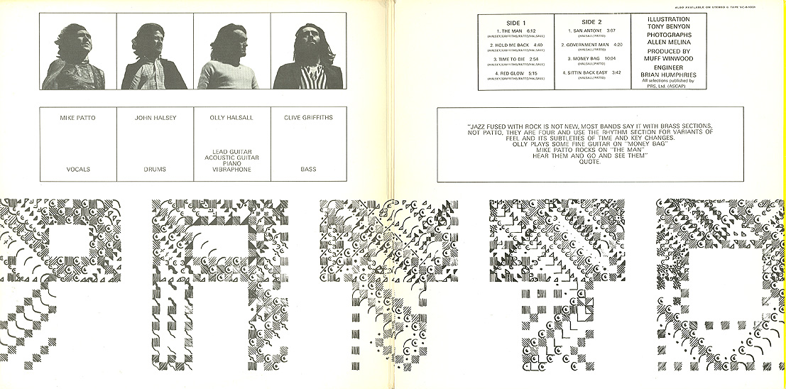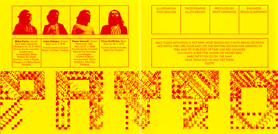 NOT NEW, MOST BANDS SAY IT WITH BRASS SECTIONS, NOT PATTO, THEY ARE FOUR AND USE THE RHYTHM SECTION FOR VARIANTS OF FEEL AND ITS SUBTLETIES OF TIME AND KEY CHANGES. OLLY PLAYS SOME FINE GUITAR ON "MONEY BAG" MIKE PATTO ROCKS ON "THE MAN" HEAR THEM AND GO AND SEE THEM" QUOTE. |
