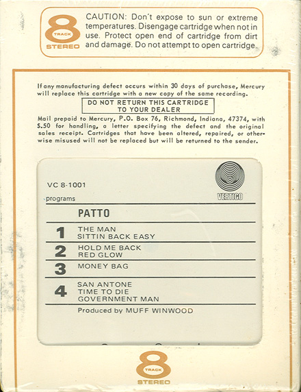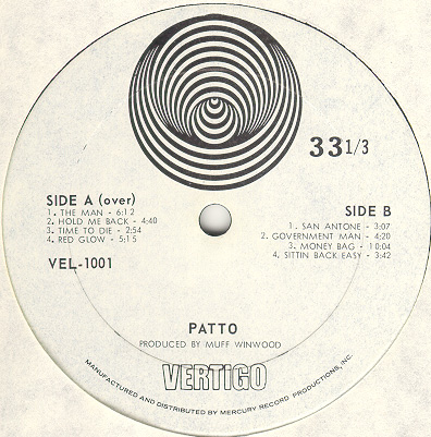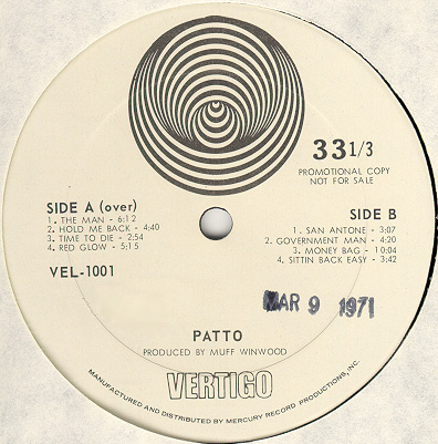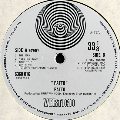 Reviews of the album: Melody Maker, December 12, 1970 "Patto" has been released on CD by a variety of labels in a variety of countries, and over the years I have lost track of what all is out there. The earliest CDs from Repertoire did not have the nearly 15-minutes long "Hanging Rope" bonus track, which first appeared on Vertigo's 1995 repackage of the first two albums called "Sense of the Absurd". Most reissues after 1995 include the bonus track. I've seen nice looking mini-LP cover editions out on eBay and Amazon - some even had the textured cover! |
