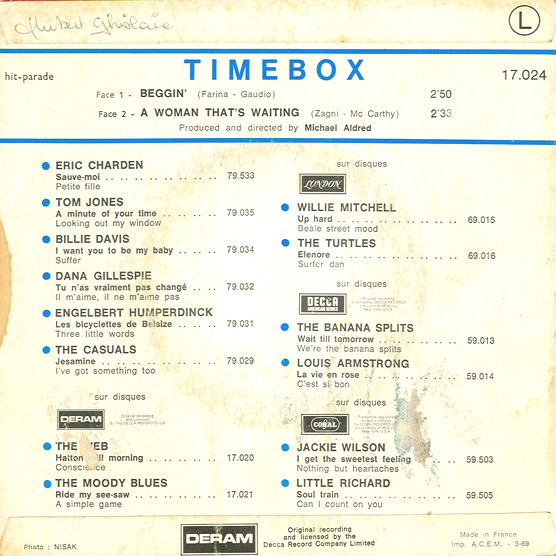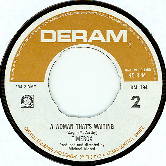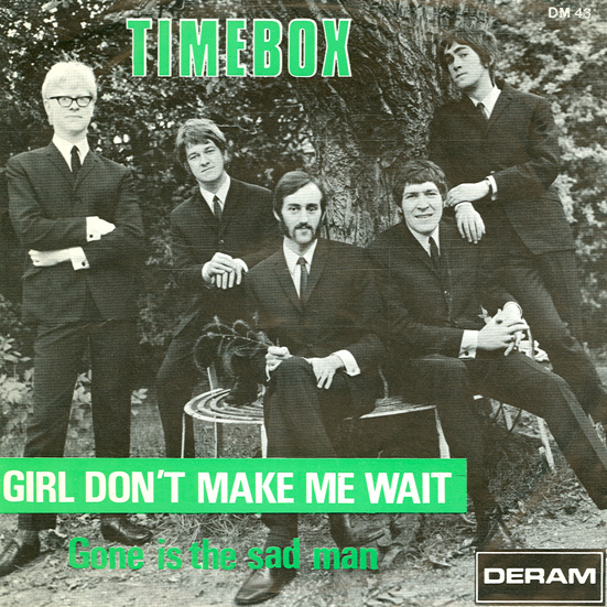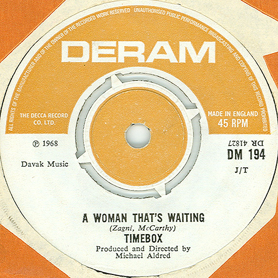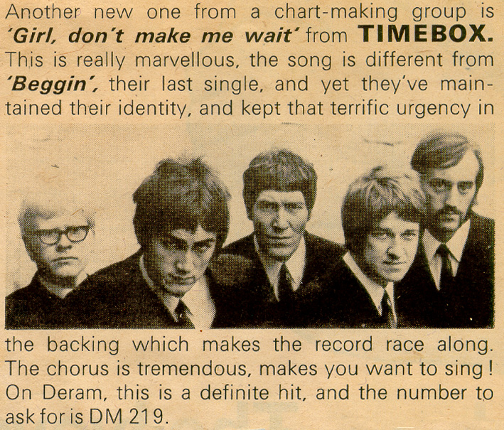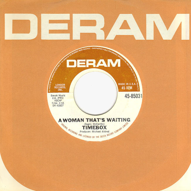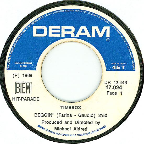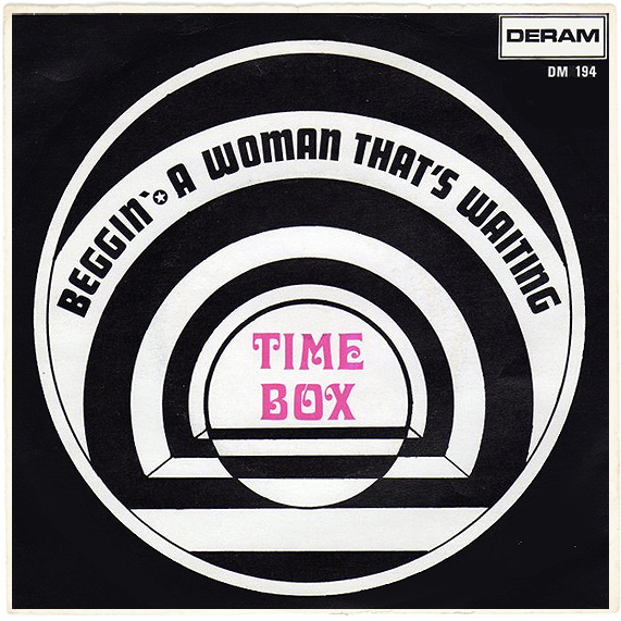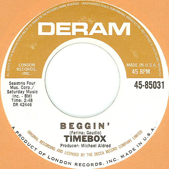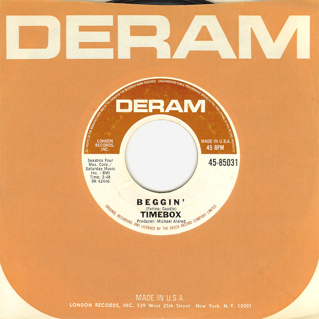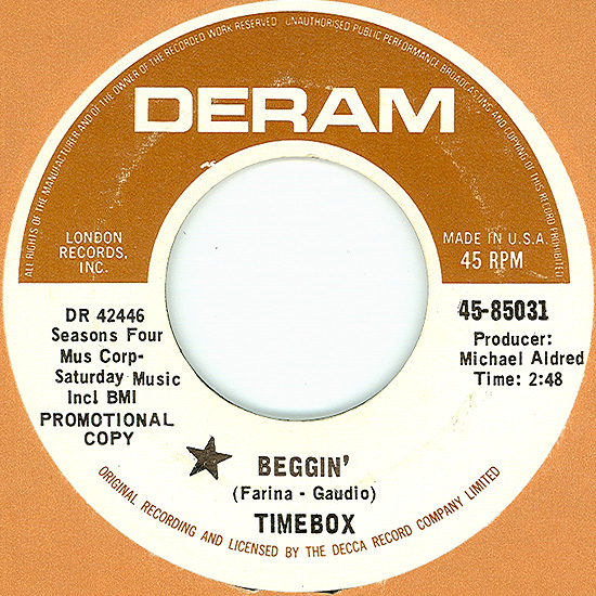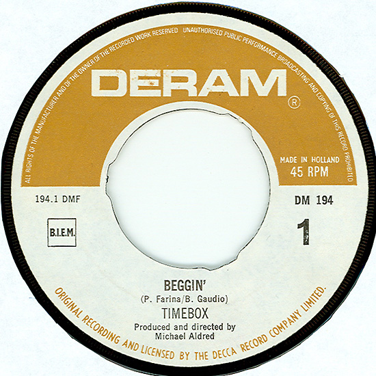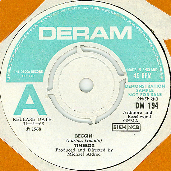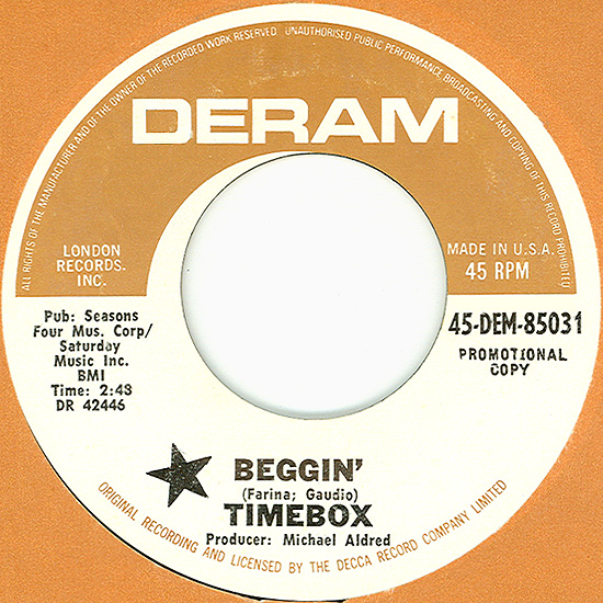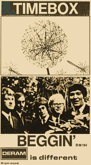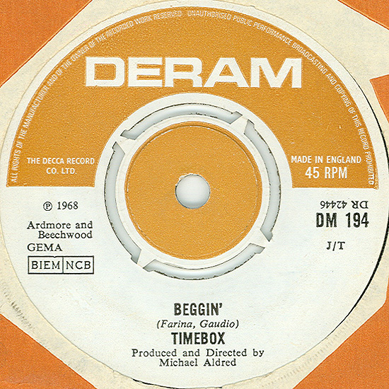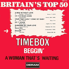 Beggin' (Peggy Farina, Bob Gaudio) c/w A Woman That's Waiting (Ivan Zagni, Mike McCarthy) Produced by Michael Aldred Deram DM 194, released May 30, 1968 USA: Deram #45-85031 This and all successive singles released as "Timebox" This was the first UK single with John Halsey on drums. The song is a finely produced remake of the Four Seasons song with an extravagant orchestral arrangement. According to John Halsey, the backing vocals are Mike, Ollie, and Clive along with Kiki Dee, and the additional percussion was played by Barry Morgan, later of Blue Mink. The writing credits for "A Woman That's Waiting" are reversed compared to those listed on the "Come On Up" single. According to John Halsey, the high vocals sung at the end of the song were done by Johnny B. Great, another Decca artist and session vocalist. His real name was Johnny Goodison, and he had a band called Johnny B. Great and the Quotations. "Beggin'" was the band's only single to achieve some success on the charts. It peaked at #38 in August, though some accounts indicate it sold more copies and received more airplay than its chart position suggested. |
