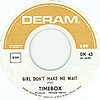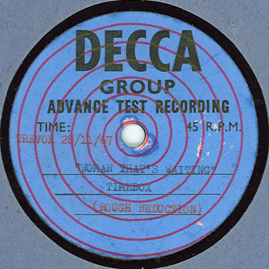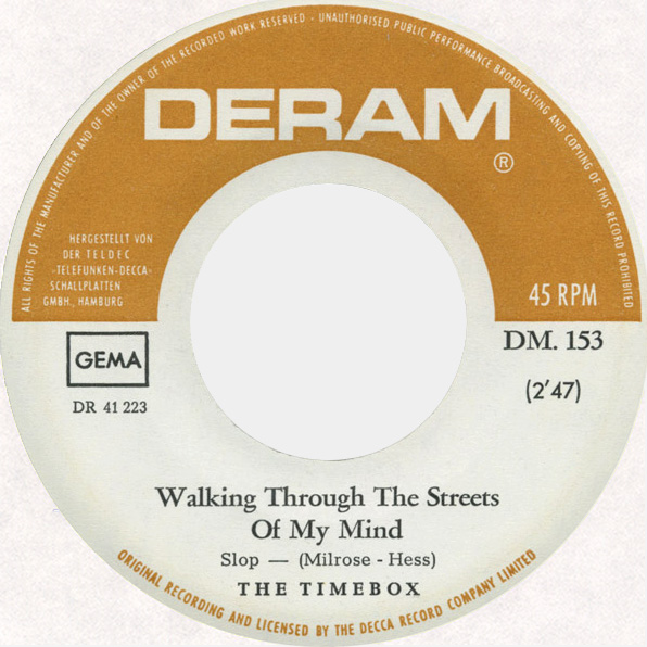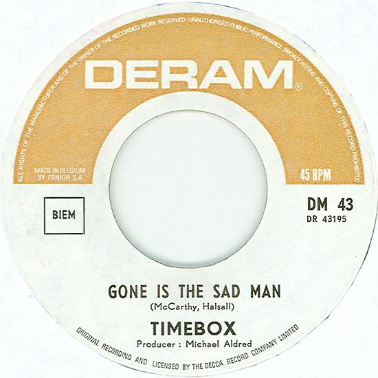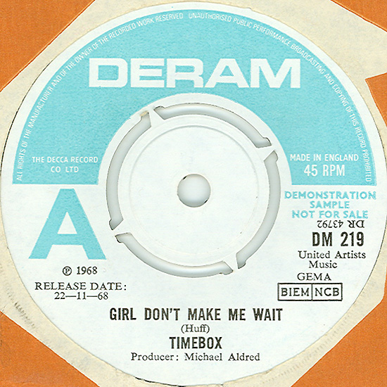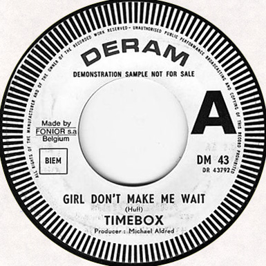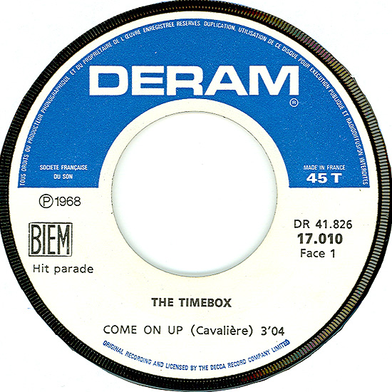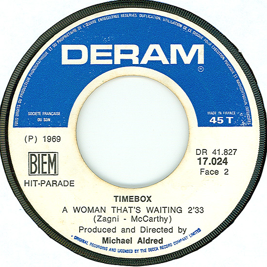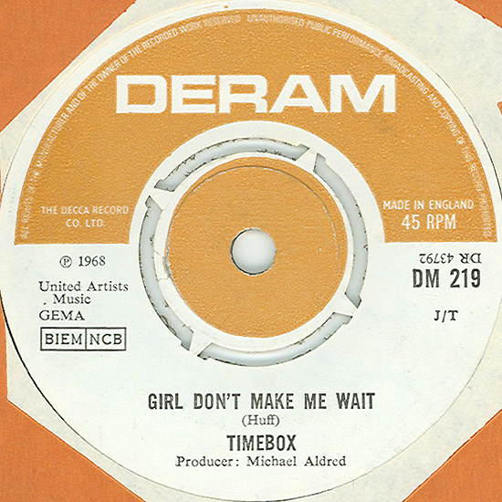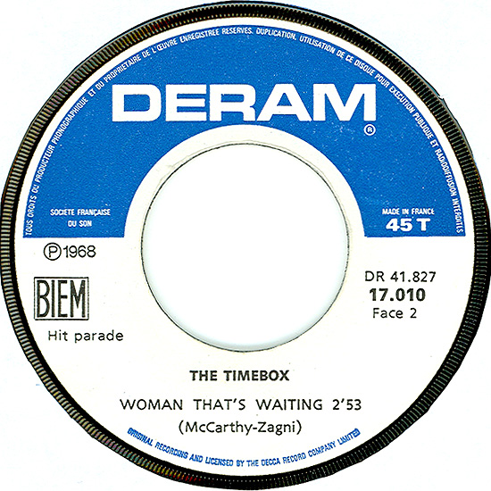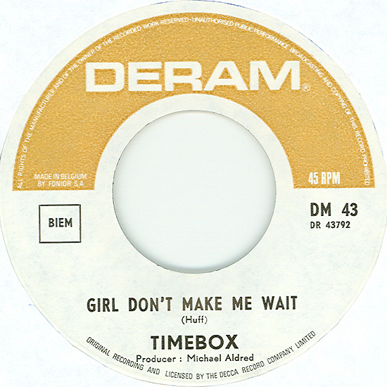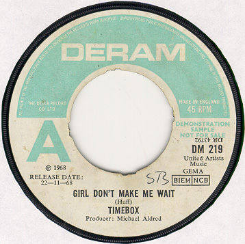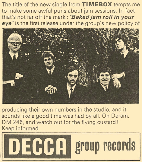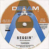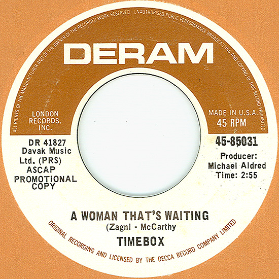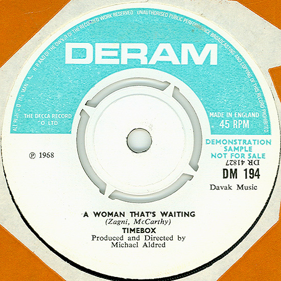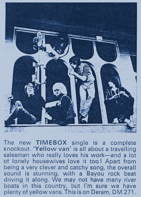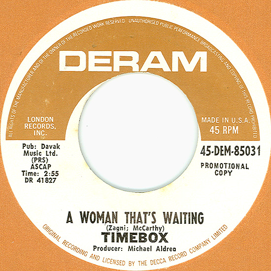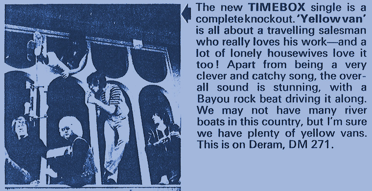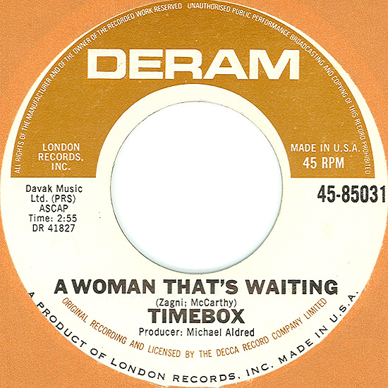 Beggin' (Peggy Farina, Bob Gaudio) c/w A Woman That's Waiting (Ivan Zagni, Mike McCarthy) Produced by Michael Aldred Deram DM 194, released May 30, 1968 USA: Deram #45-85031 This and all successive singles released as "Timebox" This was the first UK single with John Halsey on drums. The song is a finely produced remake of the Four Seasons song with an extravagant orchestral arrangement. According to John Halsey, the backing vocals are Mike, Ollie, and Clive along with Kiki Dee, and the additional percussion was played by Barry Morgan, later of Blue Mink. The writing credits for "A Woman That's Waiting" are reversed compared to those listed on the "Come On Up" single. According to John Halsey, the high vocals sung at the end of the song were done by Johnny B. Great, another Decca artist and session vocalist. His real name was Johnny Goodison, and he had a band called Johnny B. Great and the Quotations. "Beggin'" was the band's only single to achieve some success on the charts. It peaked at #38 in August, though some accounts indicate it sold more copies and received more airplay than its chart position suggested. |