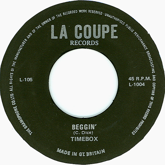 LA COUPE Records, L-1004 (UK) Released 1970? The source of this odd single indicates it is from the 1970's. The Timebox side is a stereo mix (sounds like mono reprocessed for stereo) of the song and is incorrectly credited to C. Dice instead of Farina/Gaudio. |