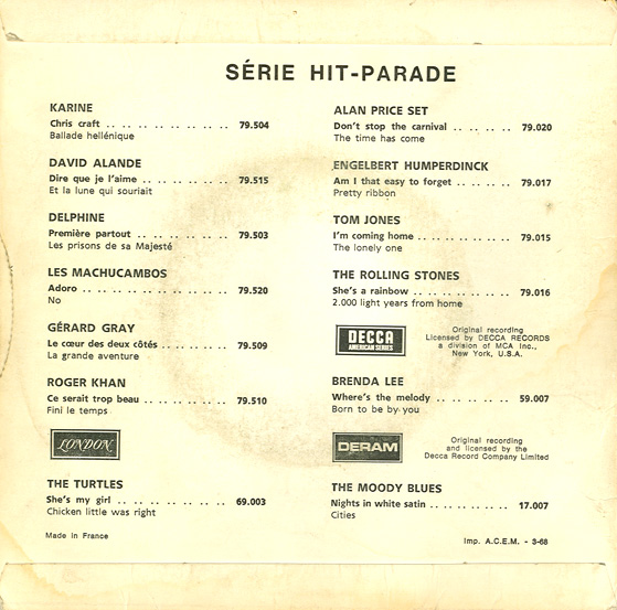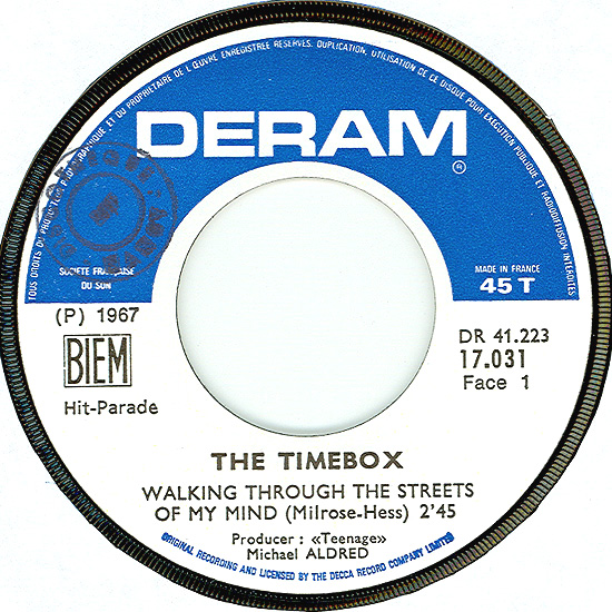 The France single and picture sleeve. Deram 41.223 / 17.031. Note that "Walking Through the Streets of My Mind" was the A-side in France. |