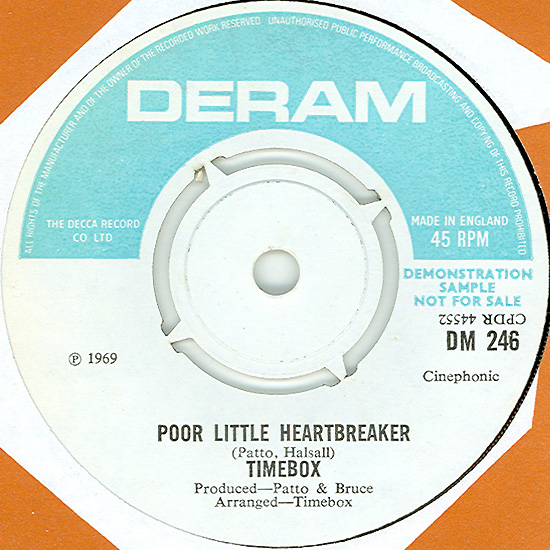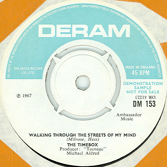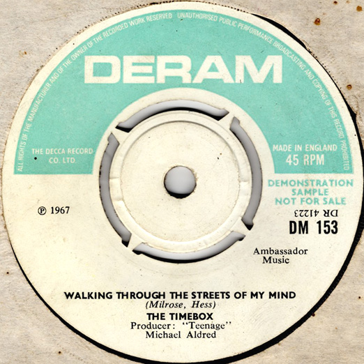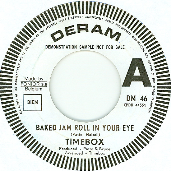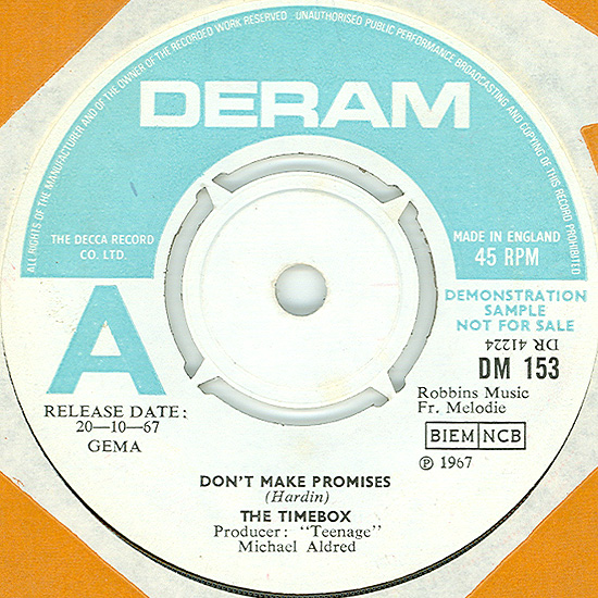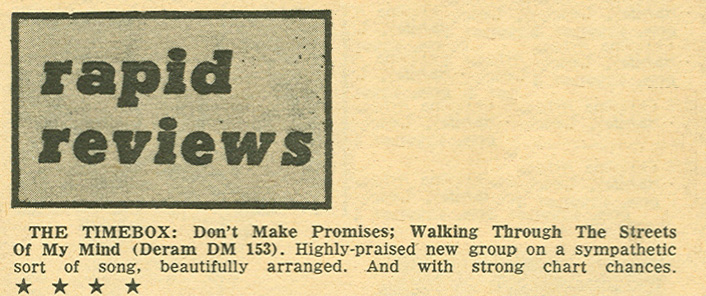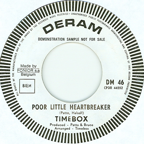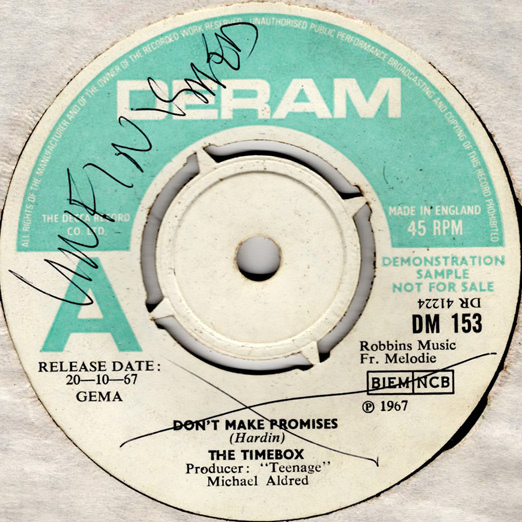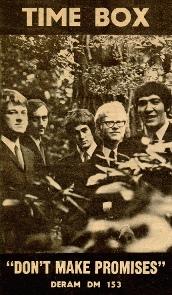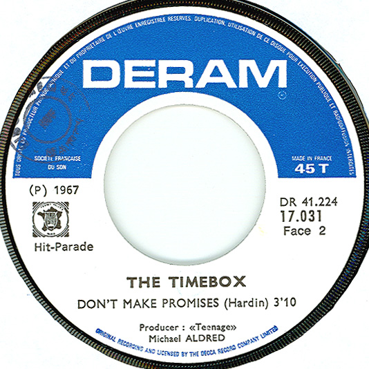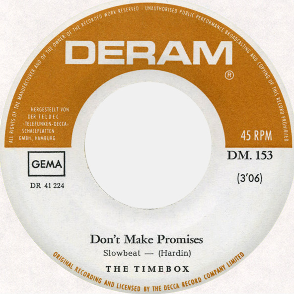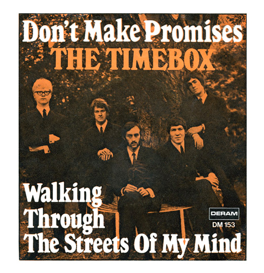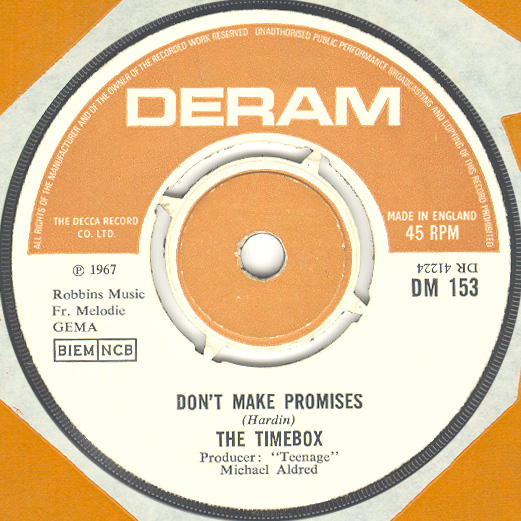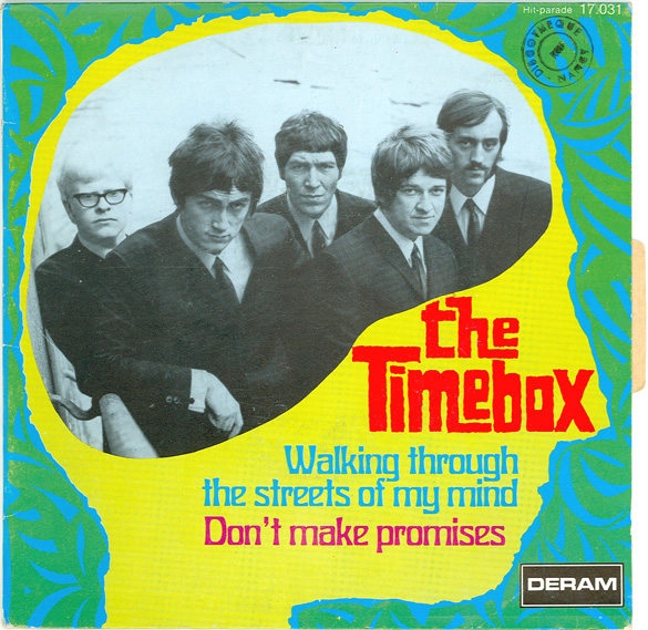 Don't Make Promises (Tim Hardin) c/w Walking Through the Streets of My Mind (Vic Millrose, David Hess) Produced by Michael Aldred Deram DM 153, released October 20, 1967 Released as "The Timebox" The first single for Deram. The A-side is the first Timebox track to feature Mike Patto on vocals. Ollie sings lead on the B-side. John Halsey confirms that he did not play drums on this single. In the absence of a regular drummer, their manager, Laurie Jay, actually played the drums. This was the last single with Kevan Fogarty on guitar. This was the first of several singles produced by Michael Aldred, who was a former presenter on the Ready Steady Go! television programme. Side A is a slower R&B number, but it includes a vibes solo, swooping bass lines, female backup singers, twangy guitars, and sitar! The promotional copy has a very different version of the song. It is an early mix of the same rhythm section but an alternate vocal take, alternate vibes 'solo', no sitar, and no backing vocals. In fact, if you look at Mike Patto's personal copy of this record, you can see that he has written "UNFINISHED" on the A-side's label. Side B has the 60's American R&B sound with a dominant vibes riff in the chorus, string arrangement, and wind chimes. Lineup for this single was Mike Patto (lead vocal on A-side), Peter "Ollie" Halsall (vibes, sitar on A-side, lead vocal on B-side), Clive Griffiths (bass), Chris Holmes (keyboards), Kevan Fogarty (guitar), and Laurie Jay (drums). |
