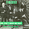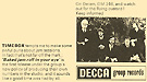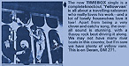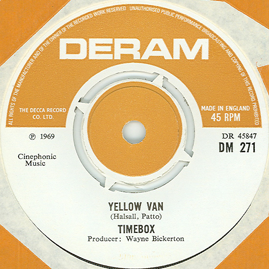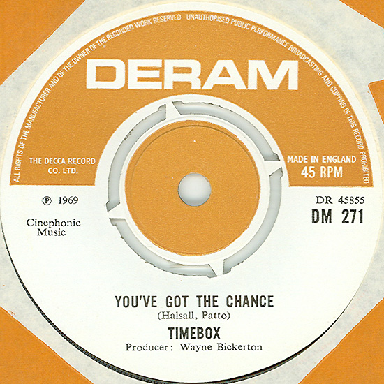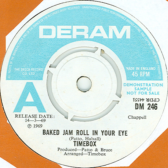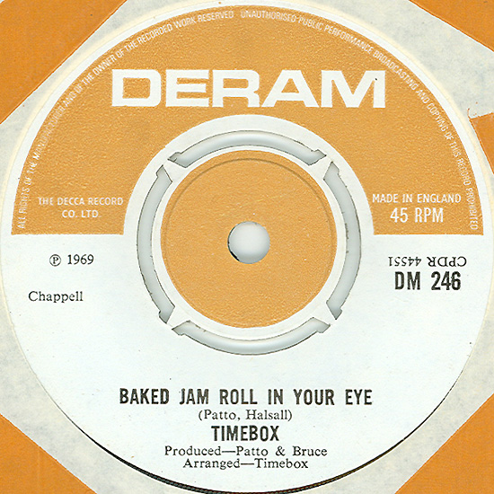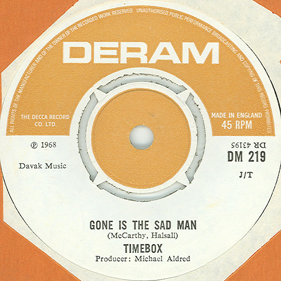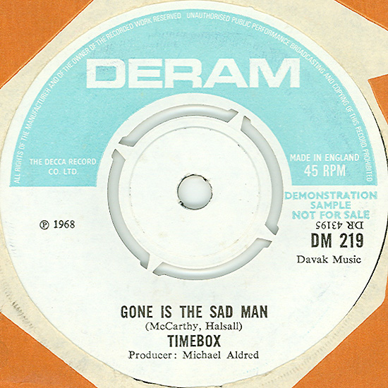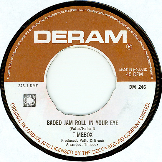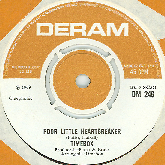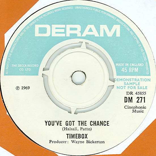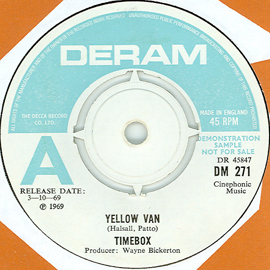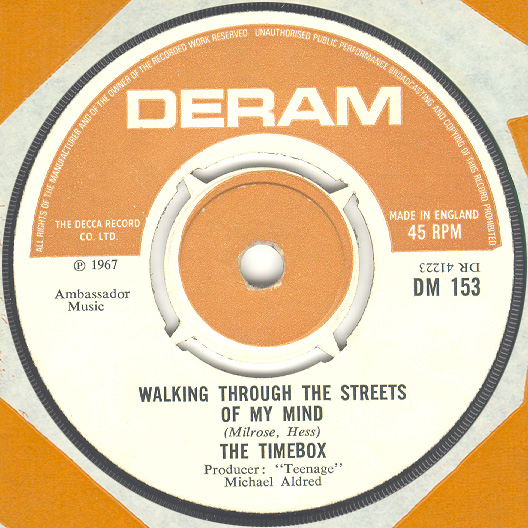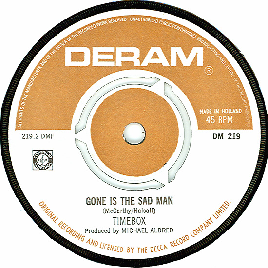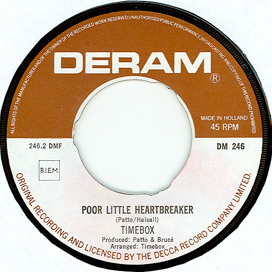 Don't Make Promises (Tim Hardin) c/w Walking Through the Streets of My Mind (Vic Millrose, David Hess) Produced by Michael Aldred Deram DM 153, released October 20, 1967 Released as "The Timebox" The first single for Deram. The A-side is the first Timebox track to feature Mike Patto on vocals. Ollie sings lead on the B-side. John Halsey confirms that he did not play drums on this single. In the absence of a regular drummer, their manager, Laurie Jay, actually played the drums. This was the last single with Kevan Fogarty on guitar. This was the first of several singles produced by Michael Aldred, who was a former presenter on the Ready Steady Go! television programme. Side A is a slower R&B number, but it includes a vibes solo, swooping bass lines, female backup singers, twangy guitars, and sitar! The promotional copy has a very different version of the song. It is an early mix of the same rhythm section but an alternate vocal take, alternate vibes 'solo', no sitar, and no backing vocals. In fact, if you look at Mike Patto's personal copy of this record, you can see that he has written "UNFINISHED" on the A-side's label. Side B has the 60's American R&B sound with a dominant vibes riff in the chorus, string arrangement, and wind chimes. Lineup for this single was Mike Patto (lead vocal on A-side), Peter "Ollie" Halsall (vibes, sitar on A-side, lead vocal on B-side), Clive Griffiths (bass), Chris Holmes (keyboards), Kevan Fogarty (guitar), and Laurie Jay (drums). |