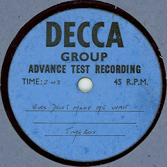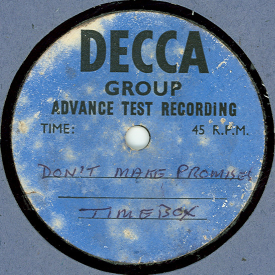 A rare one-sided Decca acetate for "Don't Make Promises". | |