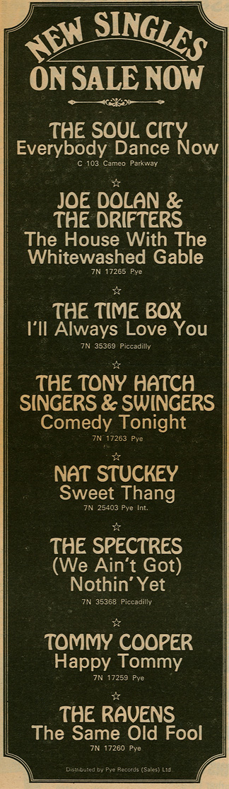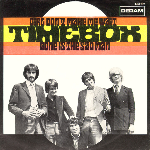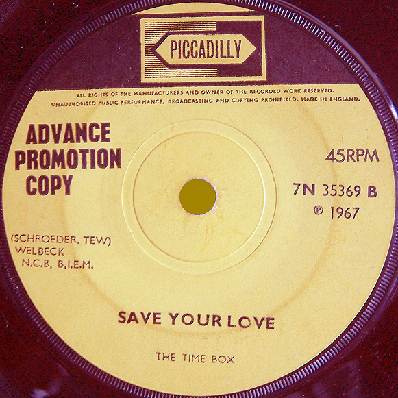 (William Stevenson, Ivy Jo Hunter) c/w Save Your Love (John Schroeder, Alan Tew) Produced by John Schroeder Piccadilly 7N 35369, released February 10, 1967 Released as "The Time Box" The lineup on their first single was John Henry (vocal), Kevan Fogarty (vocal, guitar), Peter "Ollie" Halsall (vibes), Clive Griffiths (bass), Chris Holmes (keyboards), and Jeff Dean (drums). The A-side is a 60's American soul/R&B number (Detroit Spinners), with