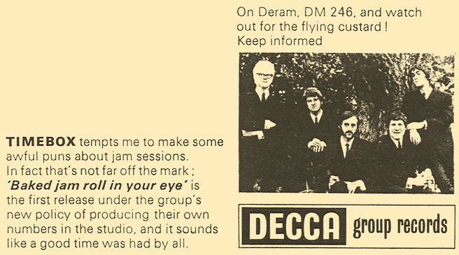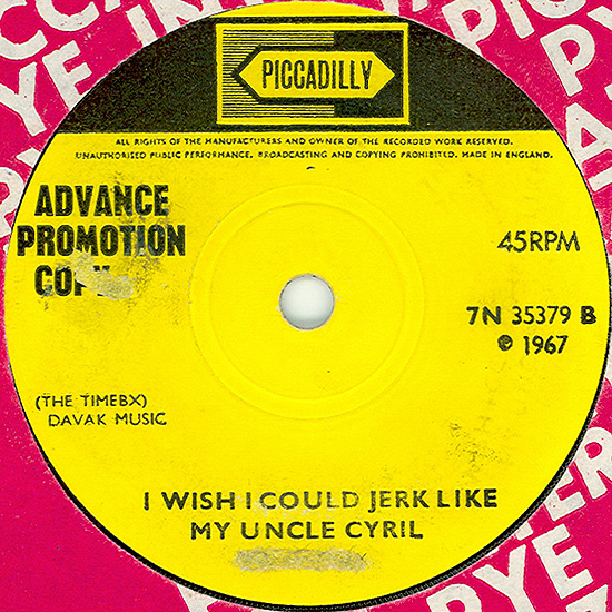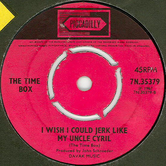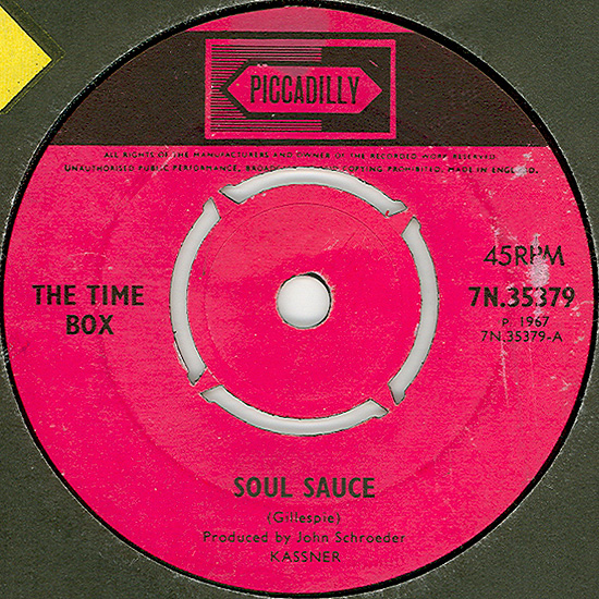 Soul Sauce (Dizzy Gillespie, Chano Pozo) c/w I Wish I Could Jerk Like My Uncle Cyril (The Time Box) Produced by John Schroeder Piccadilly 7N 35379, released April 21, 1967 Released as "The Time Box" Due to vocalist John Henry, a US Army deserter, being "retired" from the music business by military police, both cuts are instrumentals. Jeff Dean came down with TB and was replaced by a session player for this single. "Soul Sauce" is a latin soul number (Cal Tjader), whereas the B-side is a sort of 12-bar jam that was credited to the band. The lineup on this single was Kevan