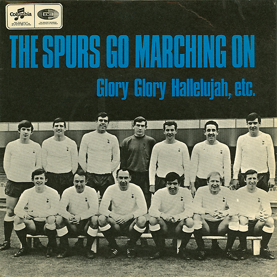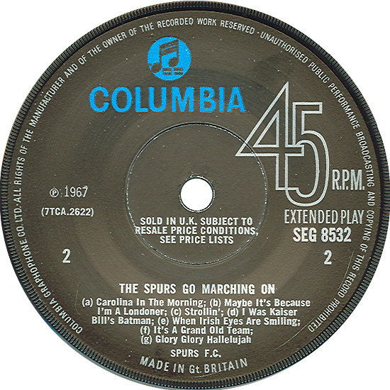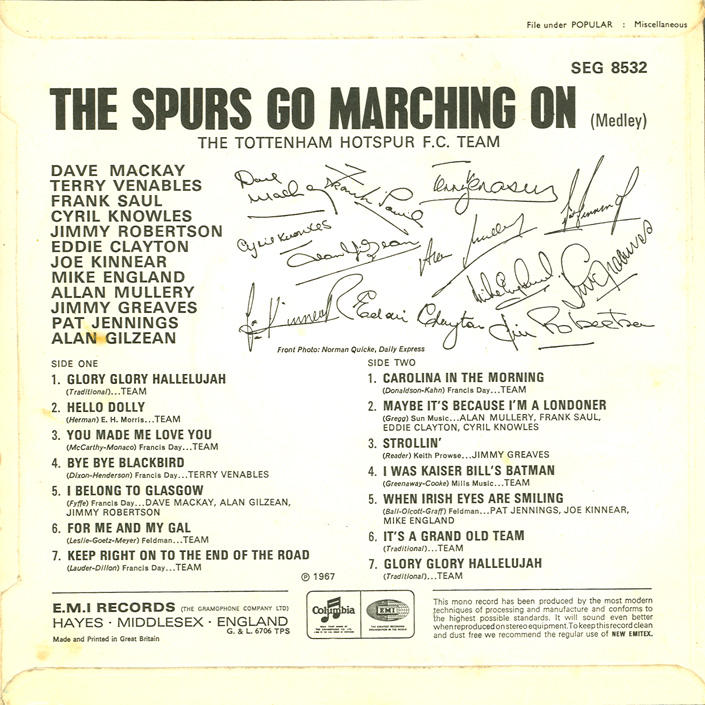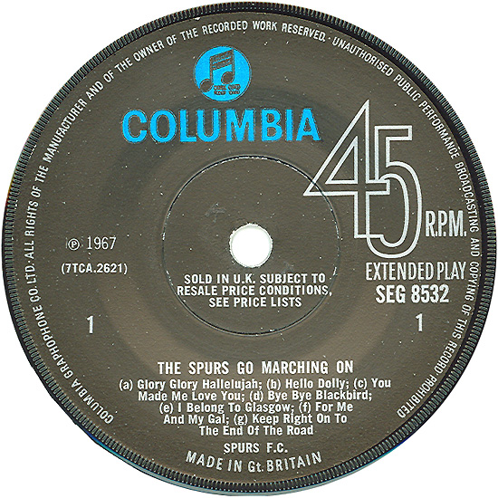 The Spurs Go Marching On: Glory Glory Hallelujah, etc. The Tottenham Hotspur F.C. Team Columbia / EMI SEG 8532, released 1967 Several sources have reported that Timebox provided the backing for this disc, including Record Mirror (see Articles And Interviews, 1967 Through May 1968). Most sources indicate the single was released in June of 1967, which would make sense, since the team won the FA cup final in May. However, the Record Mirror article indicates that the single was not released until October, and the publicity shot included below was certainly taken after John Halsey joined the band around that time. The record is basically a singsong with members of the football team taking on the likes of "Glory Glory Hallelujah," "Bye Bye Blackbird," "Maybe It's Because I'm A Londoner," and "When Irish Eyes Are Smiling." But did Timebox really play on the single? It seems they did not. John Halsey has no recollection of recording it, though one could argue that it could have been recorded before John joined the band. However, after sending a copy to Chris Holmes for him to listen to, he thinks the band did not play on the single. Really, one would never guess just by listening to the disc that Timebox is involved. For a kick-off, none of the guys in the band played the clarinet. And you'd expect there to be organ, vibes, or guitar, but none of these instruments are played. So, was the football club just fans of Timebox and someone mistakenly assumed the band played on the record? Was it just another publicity stunt dreamed up by Max Clifford, Laurie Boost, or Laurie Jay? It is not certain, but for those who do believe the band was involved, I've included scans of the record sleeve and labels. |