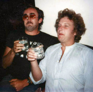 Helen, also known as Lady H, was married to drummer Tony Newman for fourteen years and was there for the Boxer years too. You can imagine the wealth of great memories she has! Well, I am happy to say that she wrote recently to share a story regarding the origin of a phrase heard in the introduction of "Flat-Footed Woman" from 1972's "Roll 'Em, Smoke 'Em, Put Another Line Out" LP. With her blessings, her story is reproduced below. Right: Ollie and Tony Newman. Note that it looks like Ollie is wearing a shirt that reads "All You Need Is Cash," a Rutles reference. (Photo courtesy of Helen Newman) |