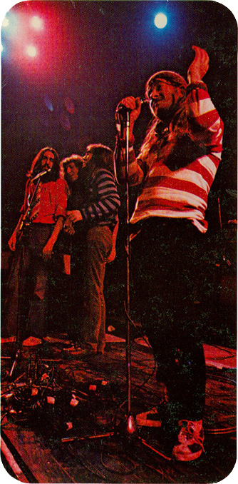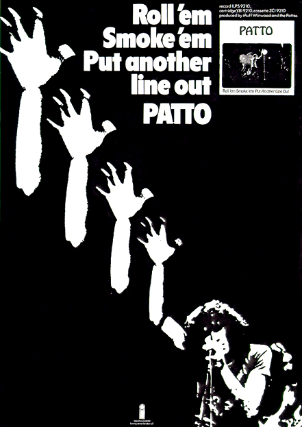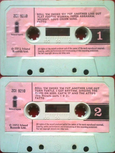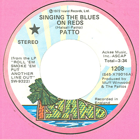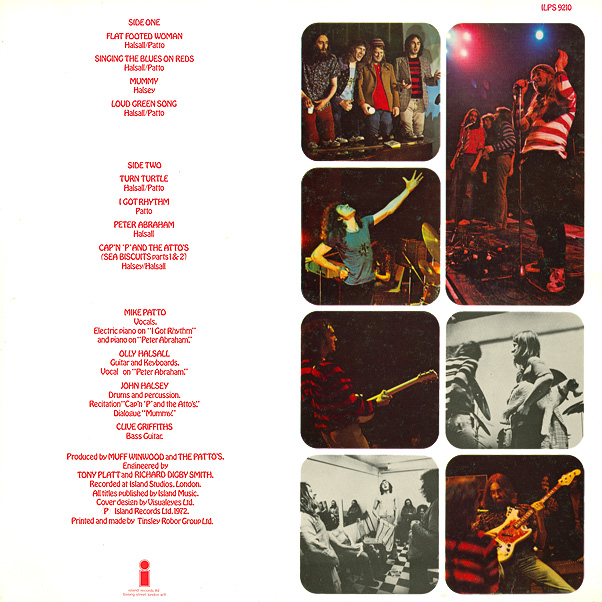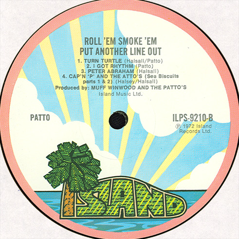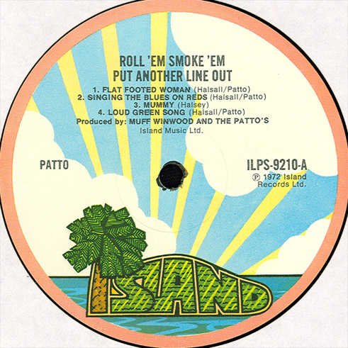 Patto's third album was released on Island Records. Compared to the first two albums, "Roll 'em Smoke 'em..." is much looser. On stage, the band was known for its humorous antics, usually referred to as "looning", which you will read more about as you browse through this web site. The band wanted to have fun with the album and have it reflect more of their humor. The album starts off with the bizarre introduction to "Flat Footed Woman" to let you know straight away that this is going to be a different type of album from the band. The looning is to the fore in John's stage favorite "Mummy", about a "grown-up subject," and the twisted sea-chanteys in "Cap'n 'P' And The Atto's". Another significant change from their earlier albums is Ollie opting to play a lot more keyboards -- he plays guitar on less than half of the album. This probably didn't please the guitar fans much, but Ollie does play some of his most outrageous guitar ever on "Loud Green Song". In fact, Nick Saloman (Bevis Frond) ranks the solos in the song as his favorite of all time! Ollie does plays some fine keyboards on the album, though. The production on "Roll 'em Smoke 'em" was their most adventurous to date. The rhythm section sounds great on this record. The band experimented more with effects (reverb, echo) on many tracks. Ollie's keyboards really fill out the sound along with the backing vocals on "Flat Footed Woman" and "Turn Turtle". There's an interesting guitar and electric piano blend on "I Got Rhythm". The middle section of "Singing The Blues On Reds" has beautiful, chiming double-track clean guitars that are complimented by Les Paul-esque runs achieved by recording with the tape slowed down. The "Singing The Blues On Reds" Single Patto did not release any singles in the UK/US from their first two albums, but a single was pulled from "Roll 'em Smoke 'em" for a US-only release. It was "Singing The Blues On Reds" coupled with (can you believe it?) "Mummy"! "Singing The Blues On Reds" was edited from 4:50 down to 3:34 for the single. The following were edited out: second verse, second chorus (the one time Mike sings "screwing in hotel beds" rather than "sleeping"), 15 seconds of the middle section after Mikes says "Stick with me Holy Roadie", and 8 seconds of the electric piano before the ending. It would make sense if this single was released to coincide with their American tour with Joe Cocker. The "Roll 'em Smoke 'em" LP did not come out until after the American leg of the tour was completed, however. Around the time Mike was in Spooky Tooth, he told John Halsey that he had met two DJ's that were fired for the playing the B-side while they were touring the States! Reviews of the album: Billboard,