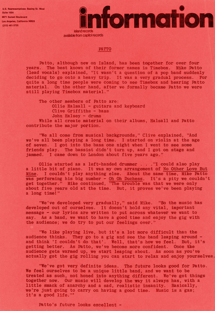 | Patto, although new on Island, has been together for over four years. The best known of the their former names is Timebox. Mike Patto (lead vocals) explained, "It wasn't a question of a pop band suddenly deciding to go into a heavy trip. It was a very gradual process. For quite a long time people were coming to see Timebox and hearing Patto material. On the other hand, after we informally became Patto we still playing Timebox material."      The other members