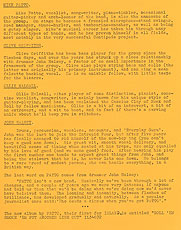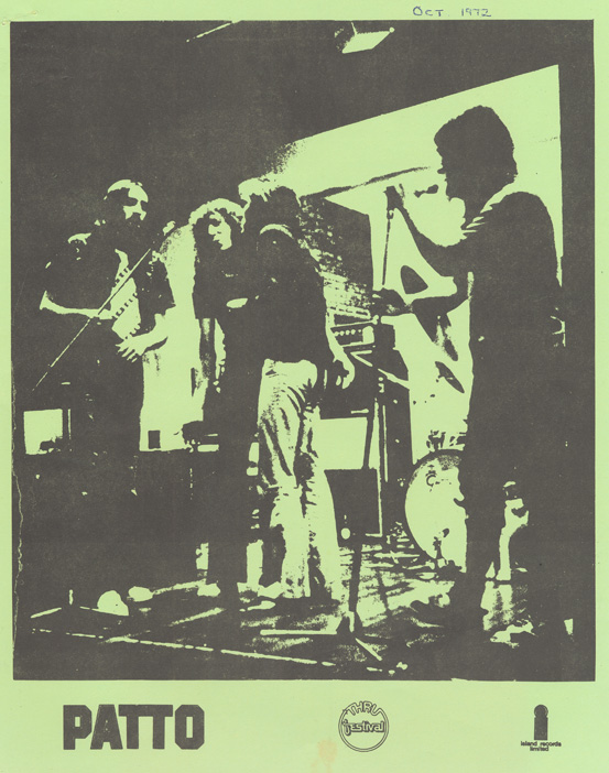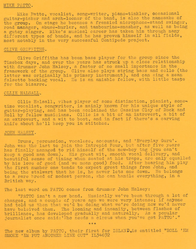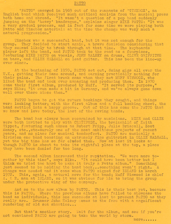 PATTO ‘PATTO’ emerged in 1969 out of the remnants of 'TIMEBOX', an English band which received much critical acclaim from the musical press both home and abroad. "It wasn’t a question of a pop band suddenly jumping on the ‘heavy’ bandwagon," explains singer MIKE PATTO: "It was a very gradual process, and in fact for some time we were playing both Patto and Timebox material: at the time the change was very much a natural progression." Timebox was a successful band, but it was not enough for the group. They decided to start again, a brave decision considering that they seemed likely to break through at that time. The keyboards player left the band, and PATTO took to the road as a four-piece, featuring MIKE PATTO on vocals, JOHN HALSEY on drums, CLIVE GRIFFITHS on bass, and OLLIE HALSALL on lead guitar. This has been the line-up ever since. At the beginning of 1970, PATTO set out, doing gigs all over the U.K., getting their name around, and earning practically nothing for their pains. The first break came when they met MUFF WINWOOD, who liked the band and took over managing and producing them. In 1970 came their first album, produced by Muff. "It served its purpose," says Mike; "it even made a hit in Germany, and we’ve always gone down well over there since then." PATTO began to get the return bookings they sought, and things were looking better; with the first album and a full booking sheet, the band settled into a happy groove. Out of this has come the PATTO that we know and love today, the last of the raving bands. The band has always been recognised by musicians. MIKE and OLLIE were both invited to play with CENTIPEDE, the brainchild of Keith Tippet, featuring such names as Robert Fripp, Julie Driscoll, Zoot Money, etc., etc. - surely one of the most ambitious projects of recent years, and no place for musical tenderfeet. PATTO are musically a division one band boasting an extremely fine guitarist in OLLIE HALSALL, yet the big time has so far eluded them. Now at last it looks as though PATTO is about to take its rightful place at the top, a place they have been denied for too long. The second album increased their reputation. "We were more together by this time", says Mike. "It could have been better but I think we tried too hard to make it truly a Patto album." Something just seemed to be holding the band back...something wasn’t right. A change was needed and it came when PATTO signed for ISLAND in March 1972. This, again, a natural move for the band; Muff Winwood is chief A. & R. man at ISLAND, so it was obvious for him to bring the group under the protective wing of the company. And so to the new album by PATTO. This is their best yet, because this is PATTO. Where the previous albums have failed to showcase the band as individuals, this one succeeds at last to present PATTO as they really are. Drummer John Halsey comes to the fore with a magnificent rendering of old sea shanties... But that’s another story. Wait for the album, and see if you’re not convinced PATTO are going to take the world by storm. MIKE PATTO. Mike Patto, vocalist, songwriter, piano-tinkler, occasional guitar-picker and arch-looner of the band, is also the namesake of the group. On stage he becomes a frenzied microphone-stand swinger, road manager, abuse-hurler, and tambourine-smasher, as well as being a gutsy singer. Mike’s musical career has taken him through many different types of bands, and he has proven himself in all fields, most notably in the very successful Centipede project. CLIVE GRIFFITHS. Clive Griffiths has been bass player for the group since the Timebox days, and over the years has struck up a close relationship with drummer John Halsey, a factor of no small importance in the framework of the group. Clive also plays string bass and cello (the latter was originally his primary instrument), and can sing a mean falsetto backing vocal. He is an amiable fellow, with little taste for the bizarre. OLLIE HALSALL. Ollie Halsall, vibes player of some distinction, pianist, sometime vocalist, songwriter, is mainly known for his unique style of guitar-playing, and has been acclaimed the Cassius Clay of Rock and Roll by fellow musicians. Ollie is a bit of an introvert, a bit of an extrovert, and a wit to boot, and in fact if there’s a carving knife about he’ll keep you in stitches. JOHN HALSEY Drums, percussion, vocalese, accounts, and ‘Everplay Guru’. John was the last to join the Intrepid Four, but after five years has finally managed to rid himself of the new-boy tag (you can’t keep a good man down). His great wit, smooth vocal delivery, and beautiful sense of timing when seated at his traps, are only equaled by his love of good (and we mean good) food. After hearing him play the first number one tends to expect great things from John, and being the stalwart that he is, he never lets one down. He belongs to a rare breed of modest person, who can handle everything, in a British way. The last word on PATTO comes from drummer John Halsey: "PATTO isn’t a new band. Musically we’ve been through a lot of changes, and a couple of years ago we were very intense; if anyone had told us then that we’d be doing what we’re doing now we’d never have believed them. The looning and insanity, between flashes of brilliance, has developed gradually and naturally. As a popular journalist once said:’Who needs a circus when you’ve got PATTO’." The new album by PATTO, their first for ISLAND, is entitled "ROLL 'EM SMOKE ‘EM PUT ANOTHER LINE OUT" IL34672 Thanks to Satoru Yonemoto for providing this press release. |