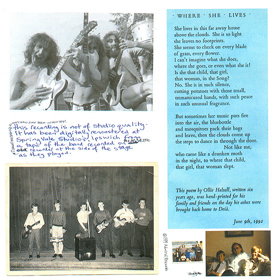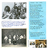 | Back of the CD booklet featuring more photos from John's archives and a poem written by Ollie. The upper left photo was another taken on the roof of Club Noreik, but it's roadie Barnabus holding up the bass drum, not John. | |